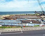 A major concern to engineers working on the St. Kilda Beach parkade is the structure's proximity to salt water, groundwater soluble contamination and the potential for rebar corrosion in the concrete. The parkade will accomodate 460 cars on two levels and is designed to be well below grade. The top side of the parkade will be covered with landscaping, which will include dirt, grass and gardens. Access to the positive side of the concrete will be impossible once construction is complete. The potential for waterproofing disaster is tremendous.